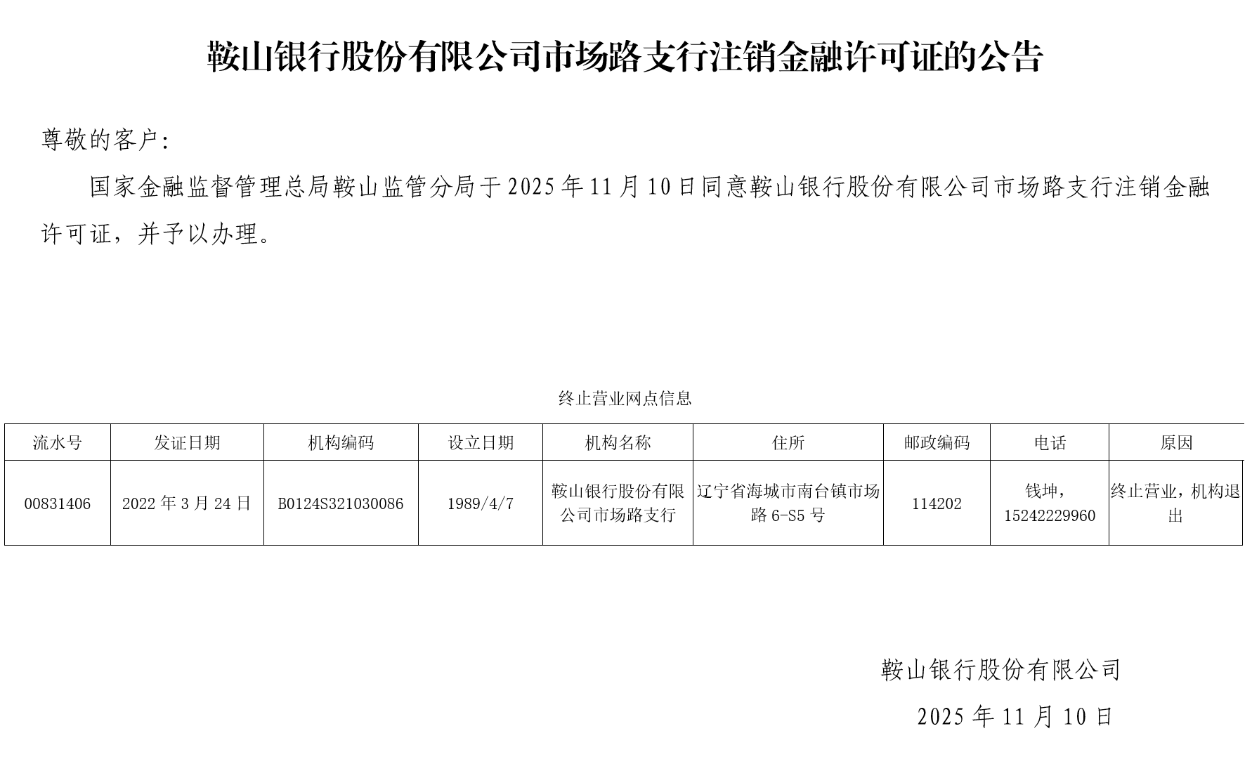鞍山银行股份有限公司市场路支行注销金融许可证的公告